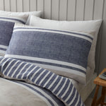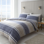 Una cara presenta gruesas rayas horizontales azules y crema, mientras que el reverso contrasta con estrechas rayas verticales.Proveniente de manera ética, fabricado según estándares de calidad y seguridad humano-ecológica, de acuerdo con STANDARD 100 por OEKO-TEX®