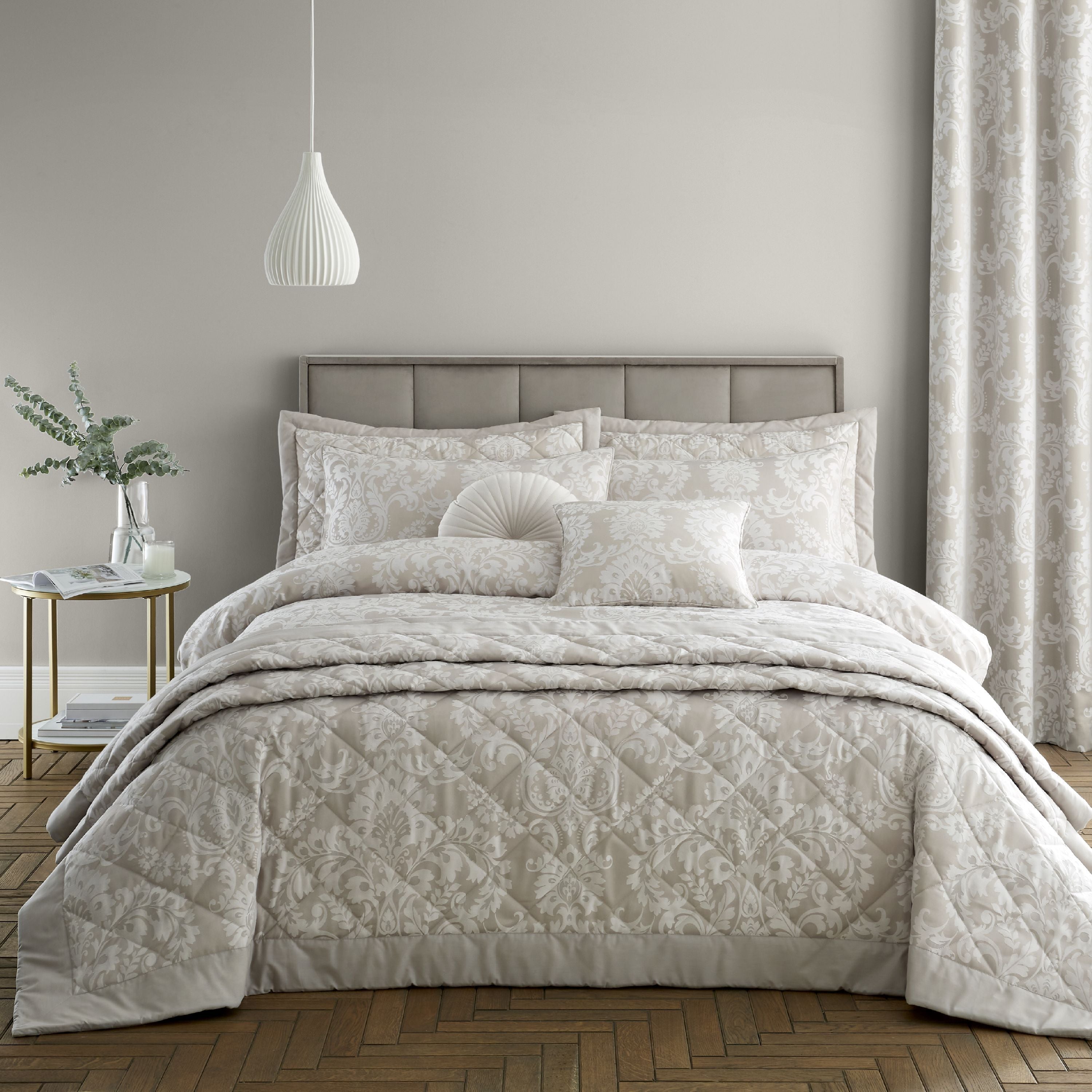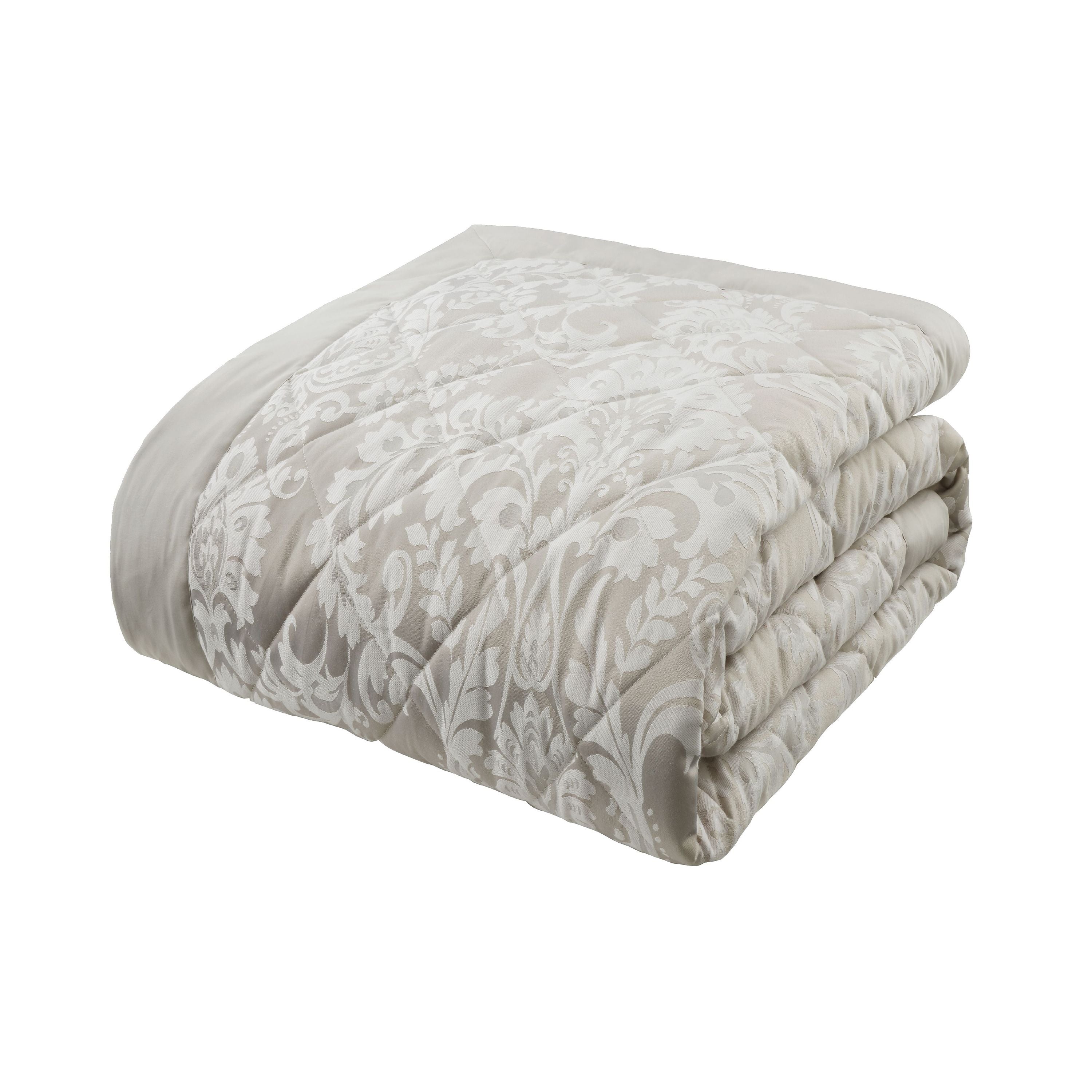 La elegancia atemporal se refleja perfectamente en esta glamurosa colcha de jacquard con diseño damasco. Acabada con un reverso de mezcla de poliéster y algodón teñido a juego y de fácil cuidado, para una comodidad total al dormir.