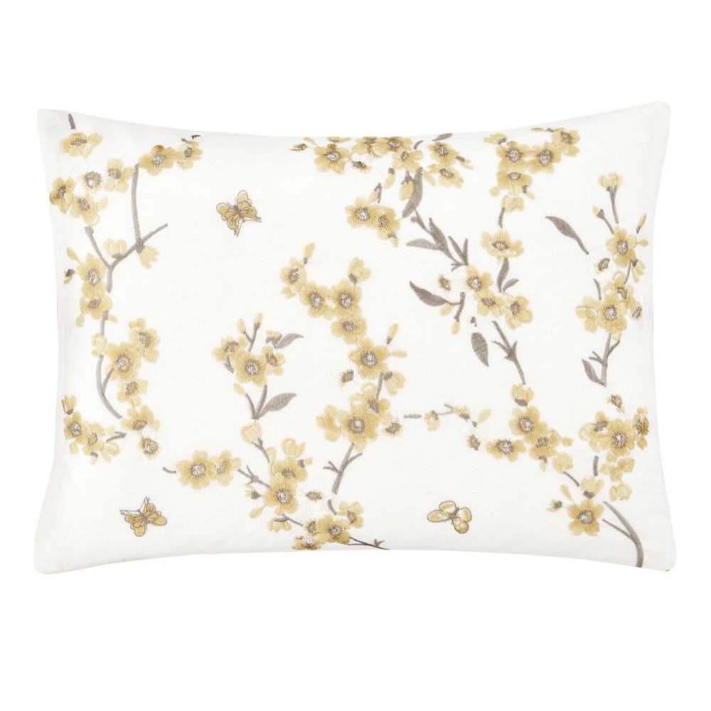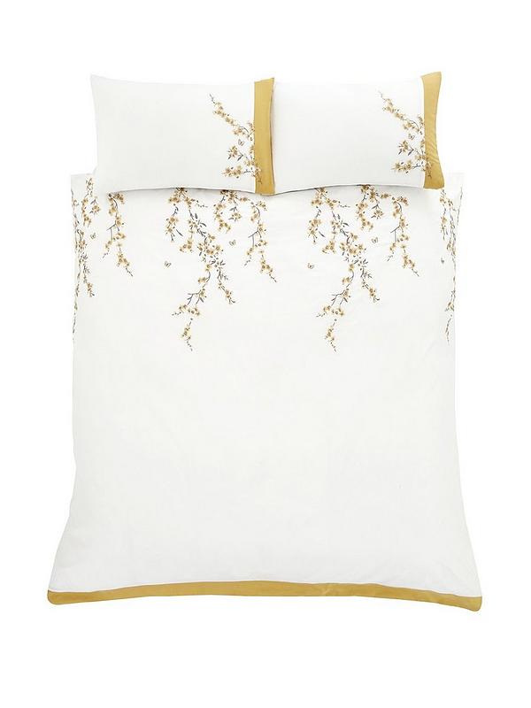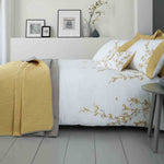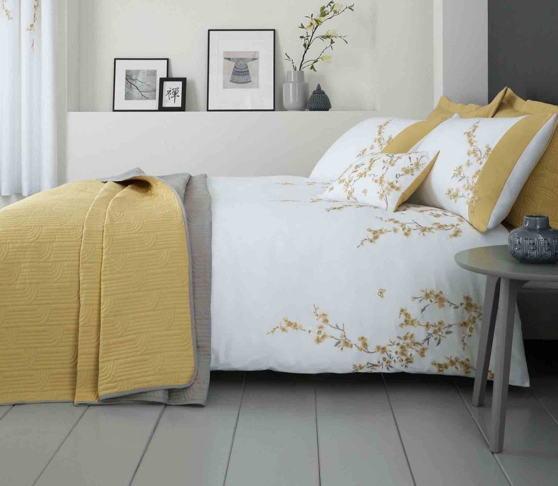 En el estilo oriental del Japonismo, este conjunto de fundas de edredón presenta ramas grises suaves bordadas de flores de ocre amarillo y mariposas revoloteantes que se superponen delicadamente sobre la cama de satén blanco fresco con un brillo suave terminado con puños de ocre amarillo. Fabricado bellamente con poliéster, este conjunto de ropa de cama es suave al tacto, duradero y lavable en máquina. Esta ropa de cama es de origen ético en el extranjero y está hecha según estrictos estándares de calidad y seguridad ecológica humana.
