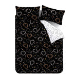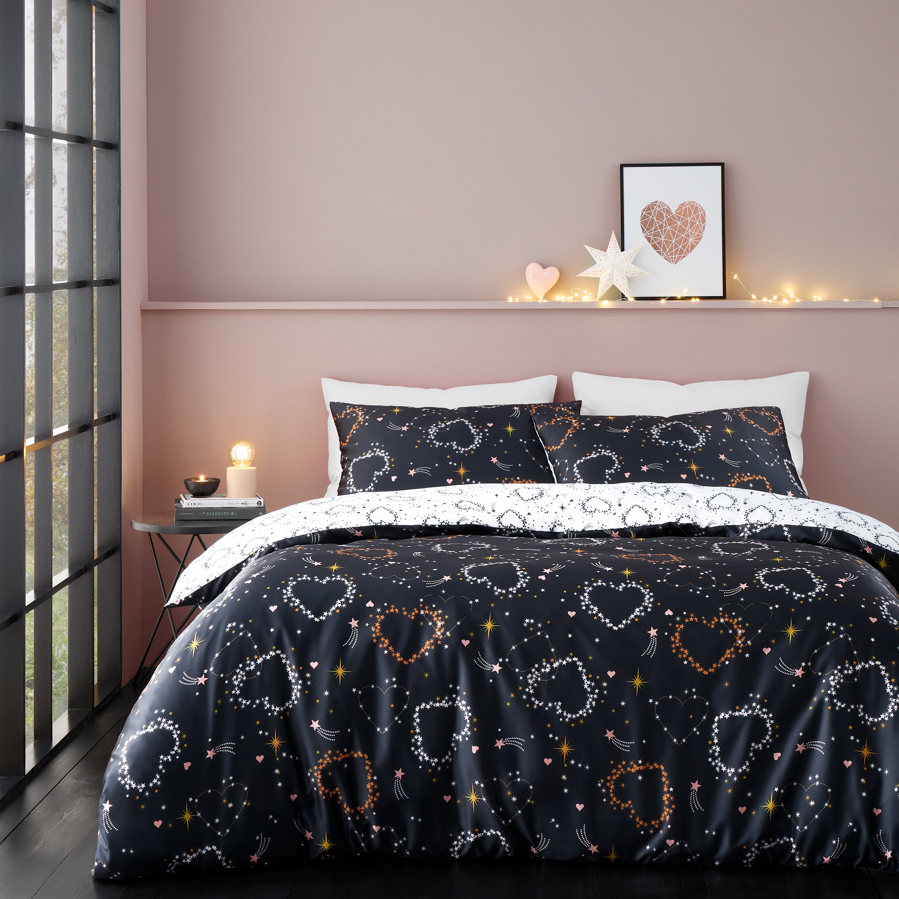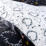 Sábana de cama reversible con corazones y estrellas cósmicas, color negro