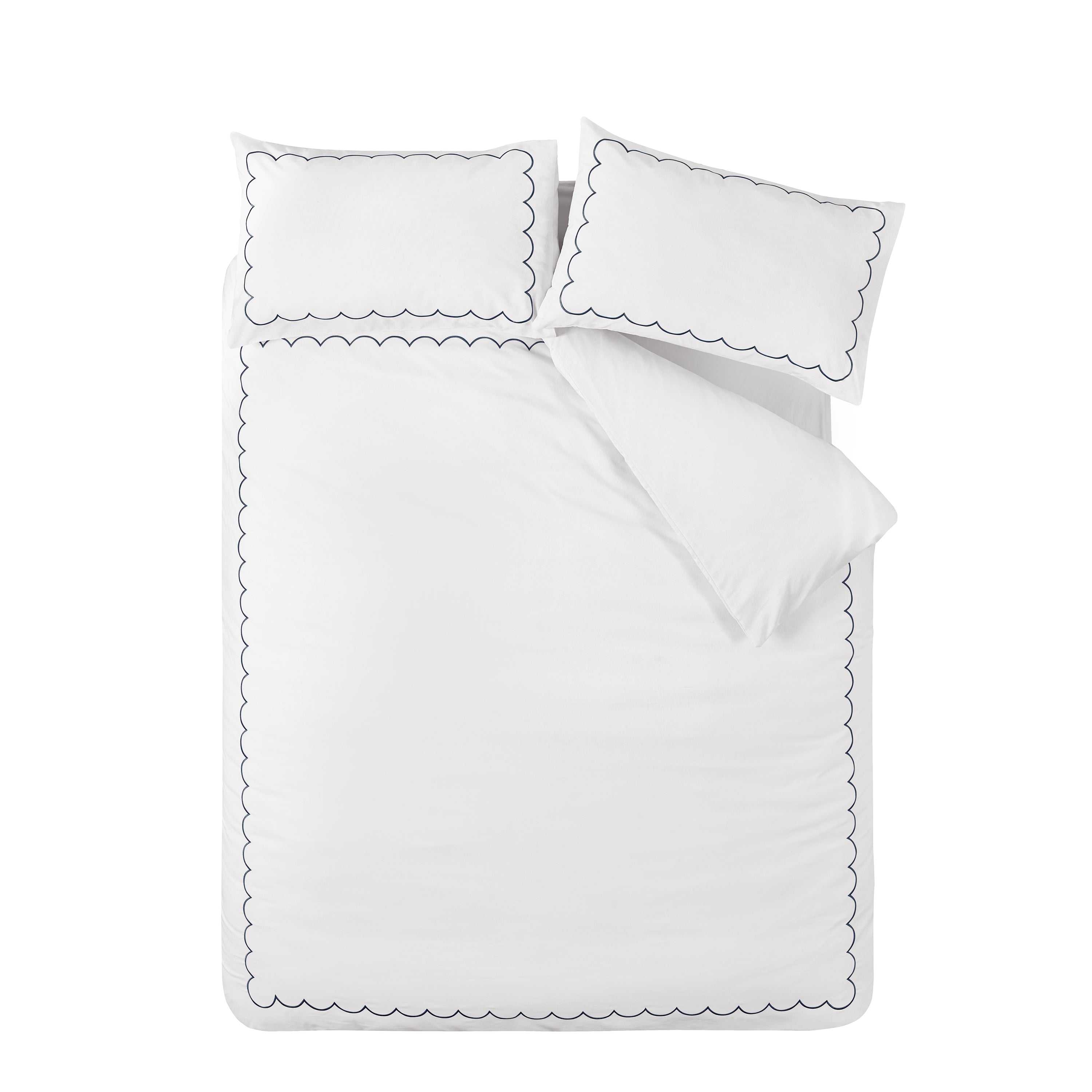Enhance your bedroom decor with this elegant bedding set, featuring a delicate scalloped border. This classic design adds a touch of sophistication and charm to any space, creating a serene and inviting atmosphere. Created from easy-care recycled polyester and soft cotton, blended for everyday use.