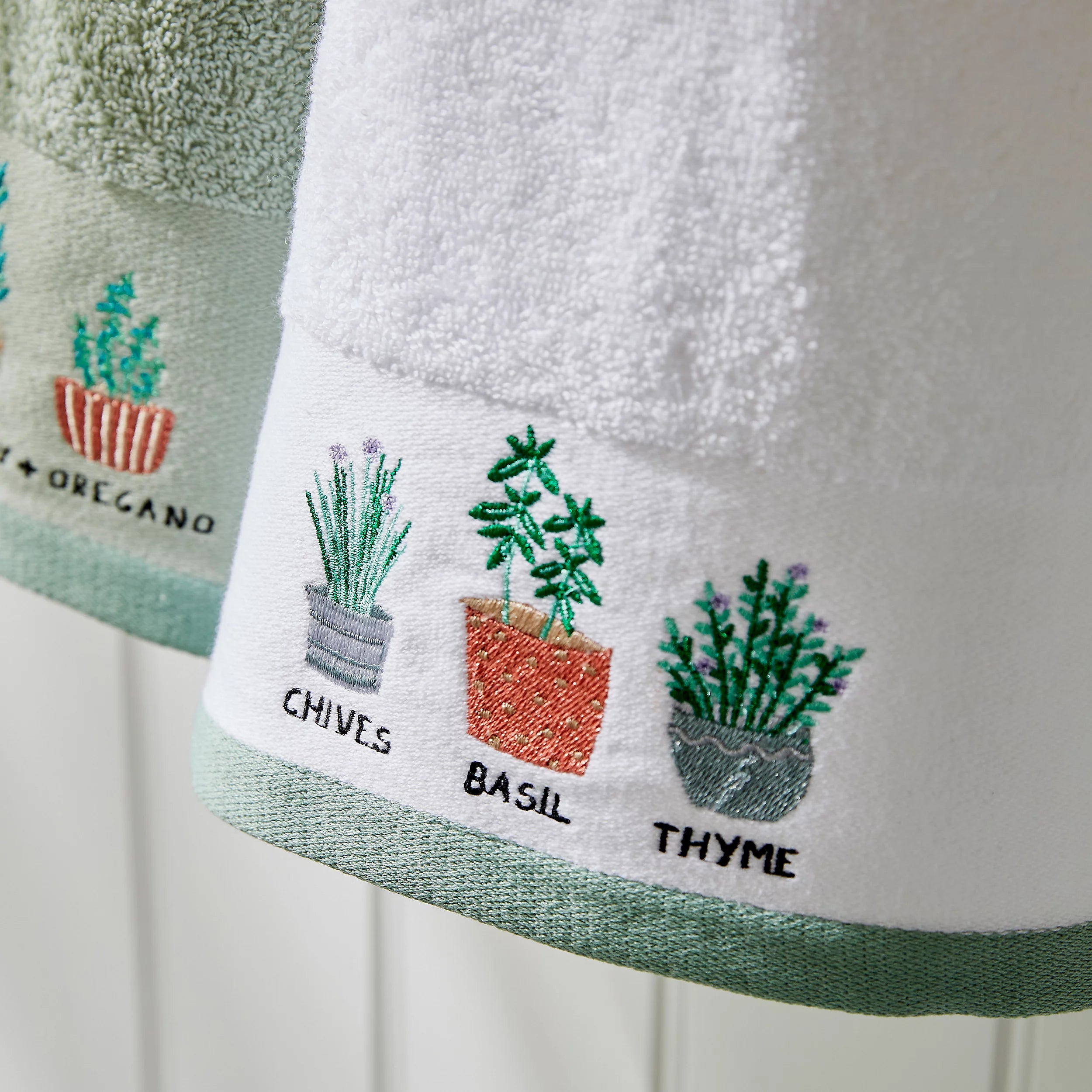 Its thyme to dry the dishes with this 4 pack of tea towels, featuring two plainer kitchen towels and two embroidered borders of mixed herb pots of rosemary, oregano, thyme, basil and chive. All super soft and adsorbent, ideal for cleaning both big and little spills. Ethically sourced overseas and made to quality and human-ecological safety standards, in accordance with STANDARD 100 by OEKO-TEX®.